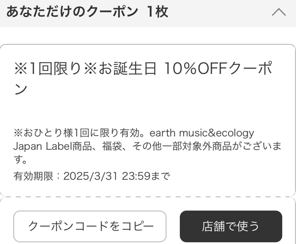 生年月日をご登録のお客様は、お誕生月になるとマイページに、「お誕生日10%OFFクーポン」が発行されます。